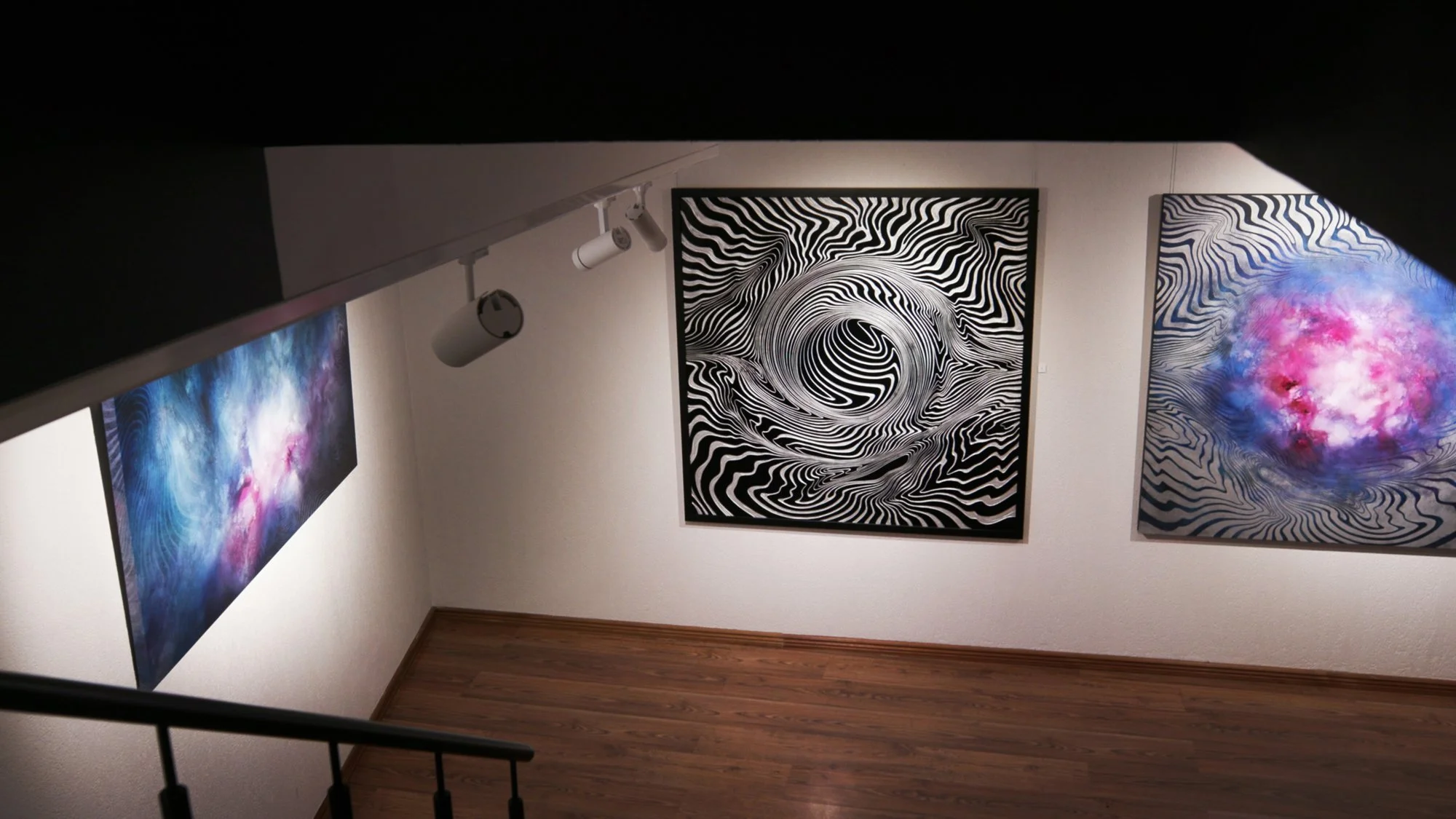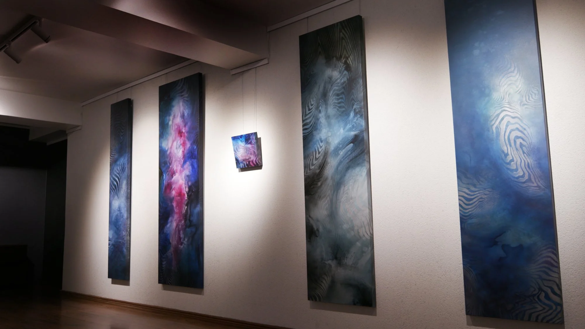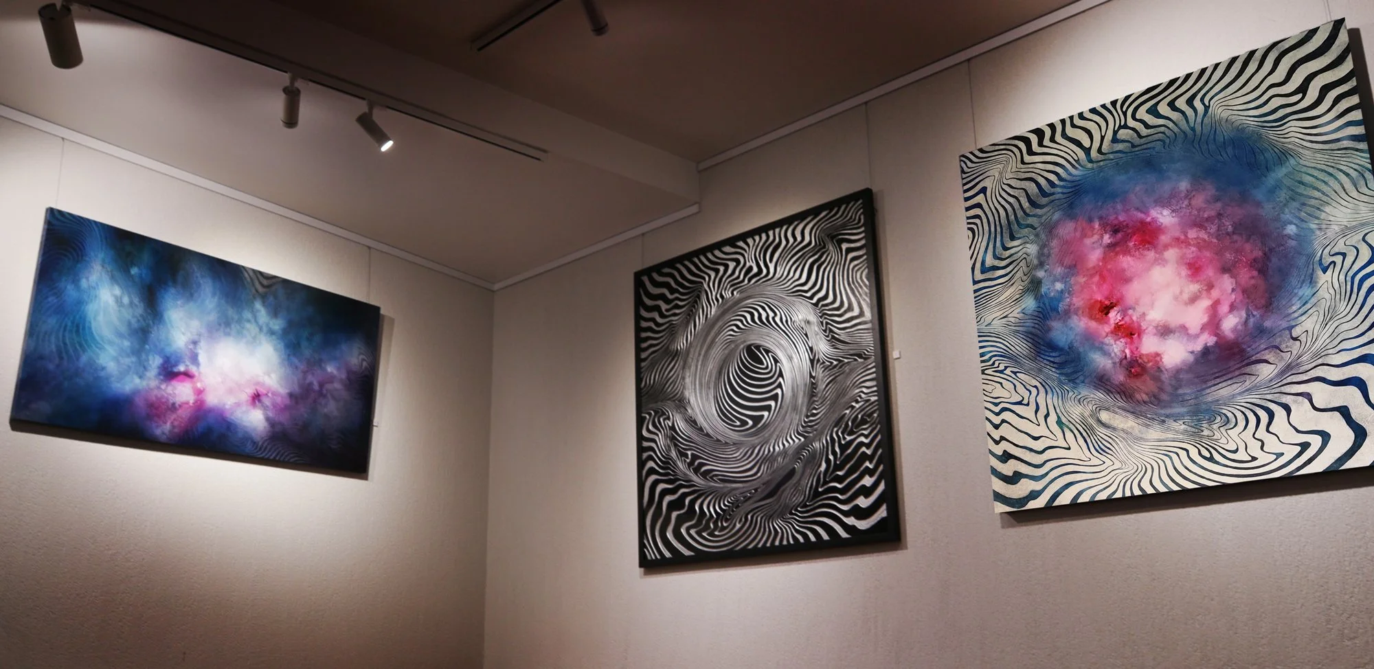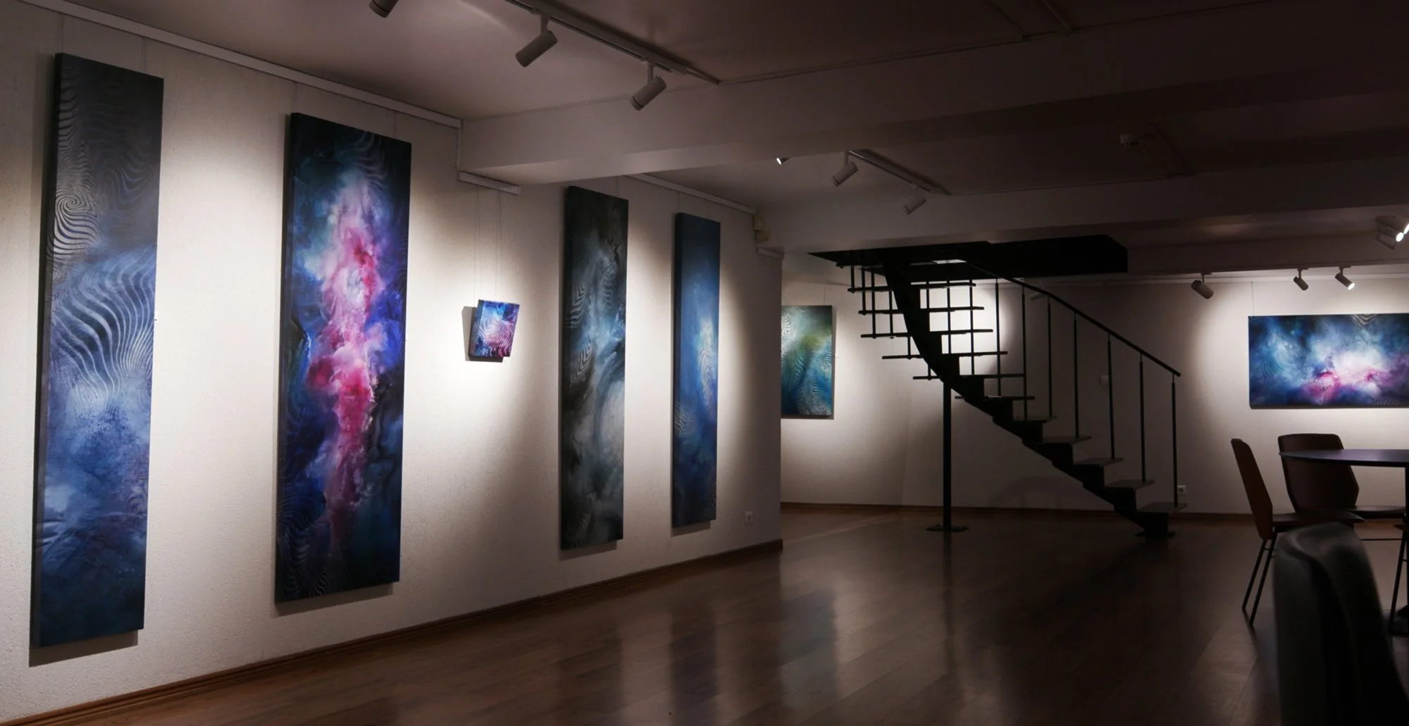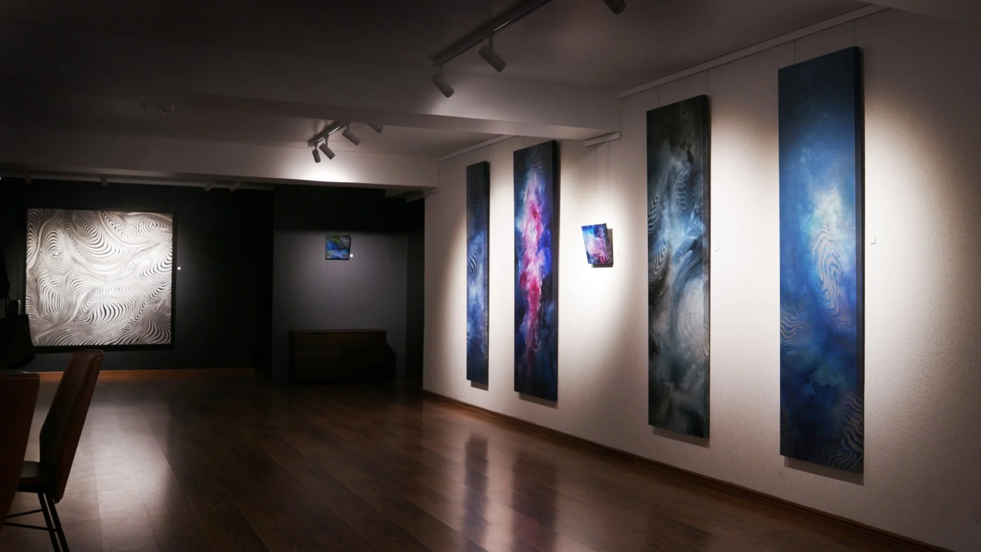 The exhibition, which is embedded between the walls of the basement hall of Haus Gallery – a few steps below the street level – is sensitively colored, playful in both the rhythm of the compositions and formats. The artist has called this series of paintings, made in mixed media, Cat Cradle. “It is a reference to a universal game, consisting of patterns woven from closed loops and certain systematic finger movements, the fingering that create this fabric. Something that comes to mind as a beautiful metaphor to describe the nature of everything earthly and living at the same time as a great game in its enormous abundance and complexity of combinations. The cat cradle illustrates the interconnectedness of all of us in this world, both at the level of each individual’s actions and collective decisions, what to perceive, feel, keep in mind and take into account. “The exhibition hall exhibits the cat cradle through picturesque surfaces, an organic, water-like flow, far from the black-and-white, positive-negative concrete paths familiar to Regina Mareta. While the author’s previous line has reflected the interpretation of large-scale meanings such as light or matter, the paintings in this series have been inspired by water. Water as a journey, movement and experience that connects thoughts and perceptions into one deeply felt creative system – a cat's cradle.